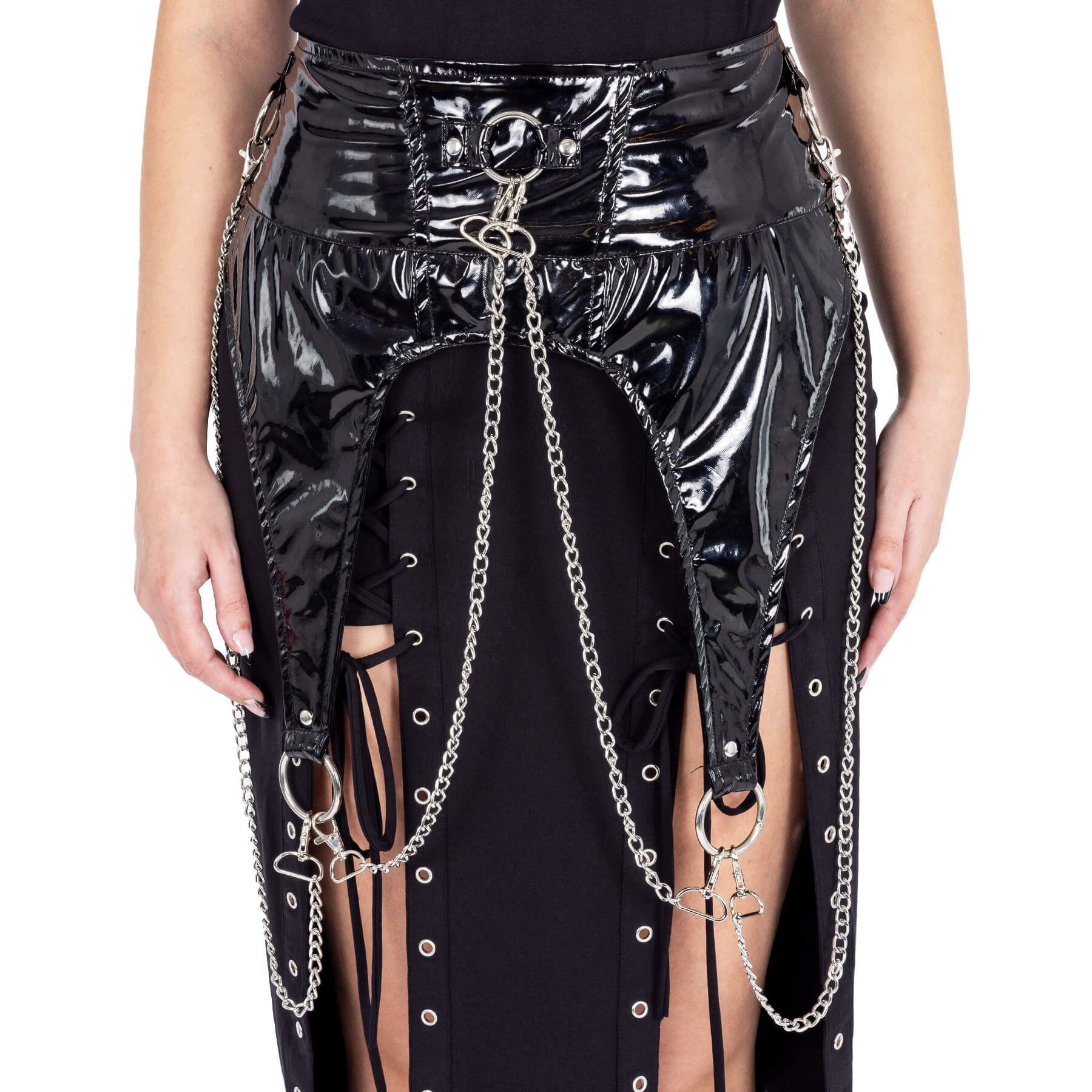 Shine meets steel: vinyl-sleek PVC, metallic embellishments, and adjustable sizing create a belt that dominates the waist.